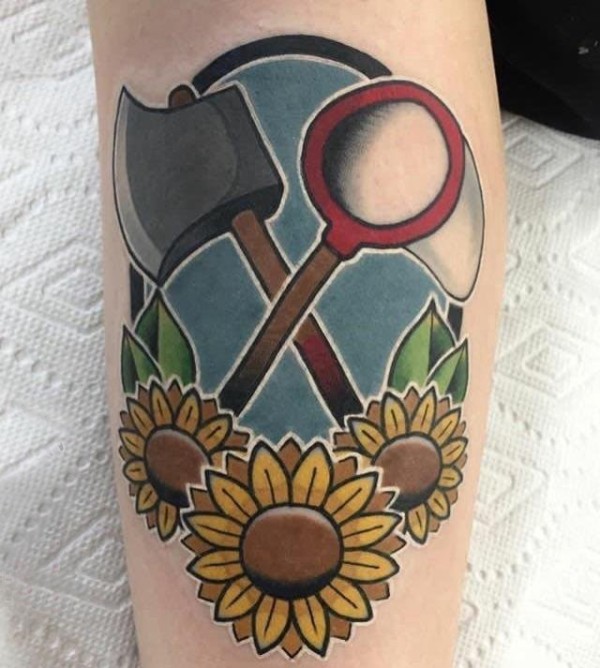 男生大腿上彩绘简单线条植物向日葵和工具纹身图片