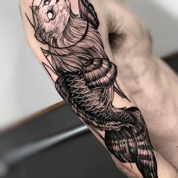 男生手臂上黑灰素描创意猫咪花臂纹身图片