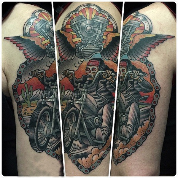男生手臂上彩绘水彩素描创意霸气摩托车纹身图片