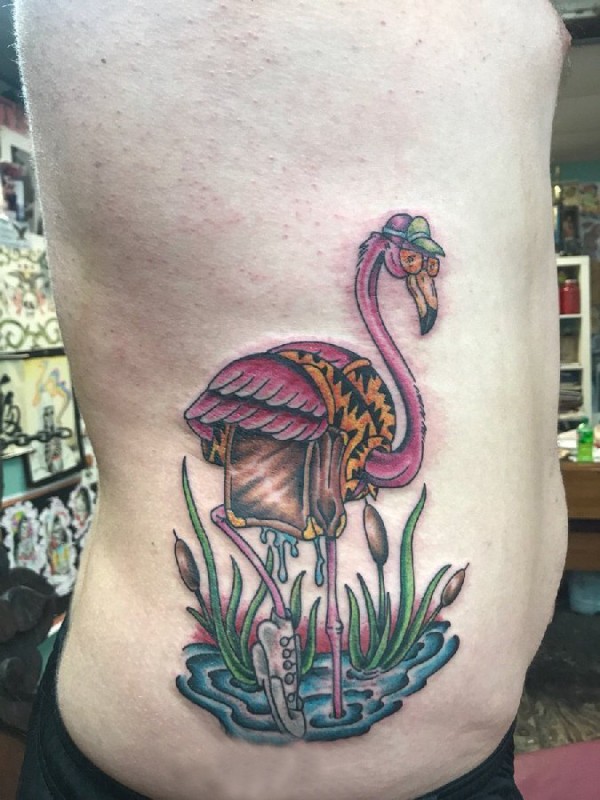 男生侧腰上彩绘简单线条植物和小动物火烈鸟纹身图片