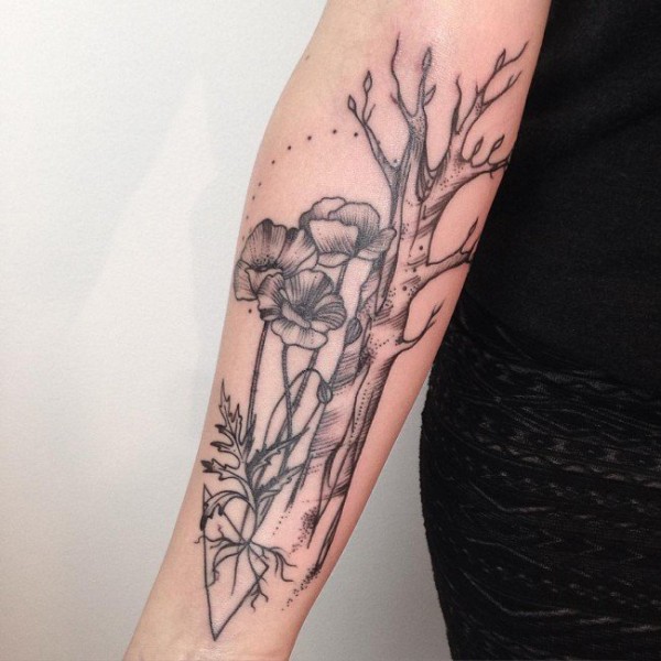 女生手臂上黑灰素描点刺技巧创意文艺花朵和树枝纹身图片