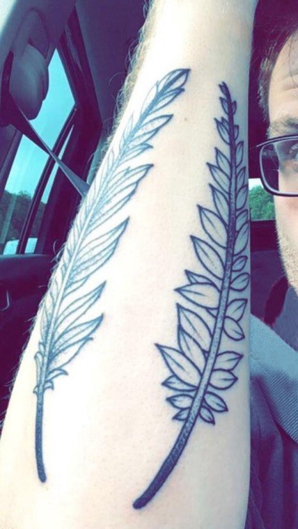 男生手臂上黑色点刺简单线条植物叶子纹身图片