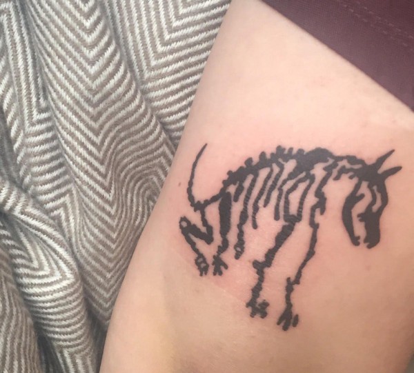 男生大腿上黑色抽象线条小动物骷髅骨架纹身图片