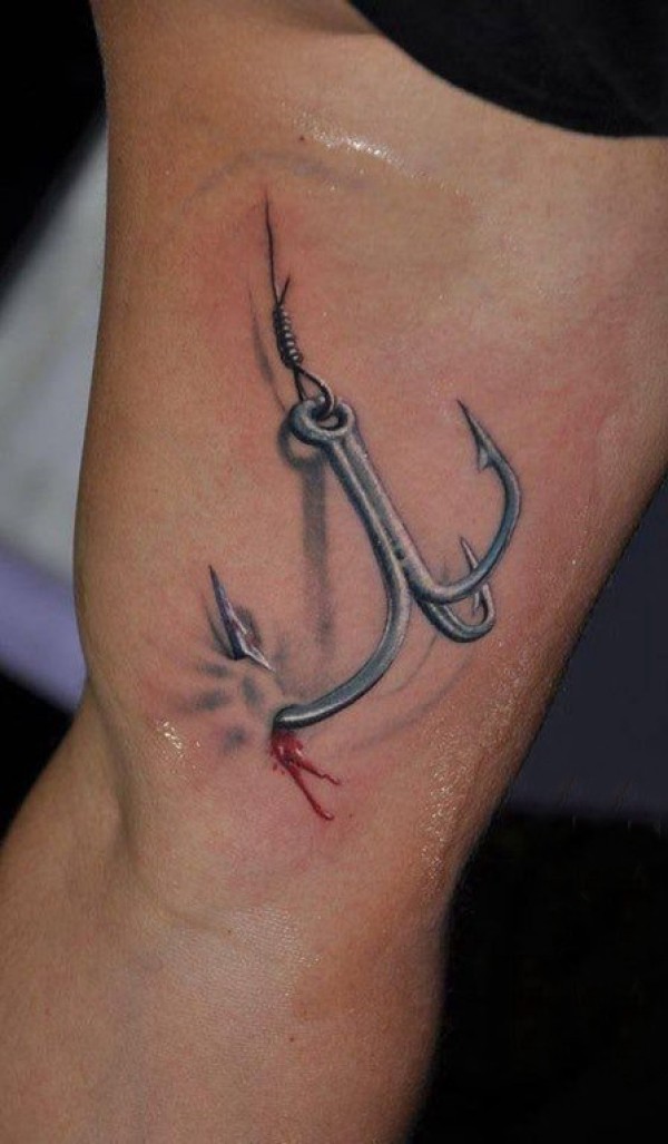 男生大腿上彩绘3d写实抽象线条鱼钩纹身图片