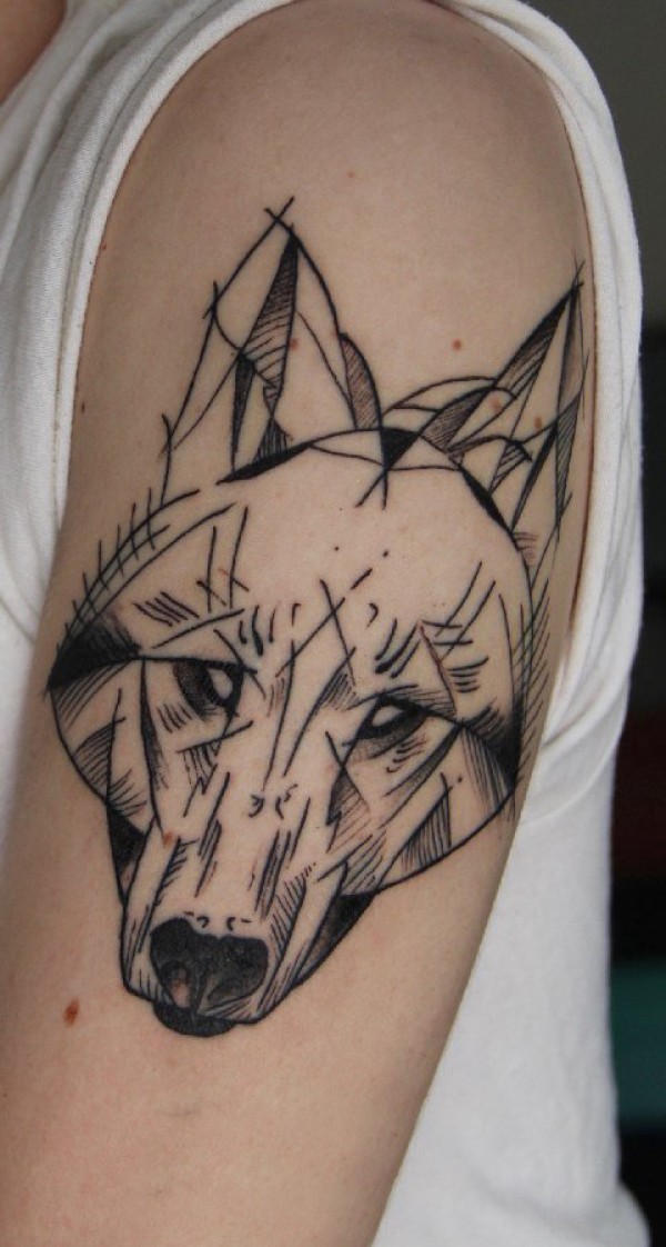 男生手臂上黑色素描简单线条小动物狼纹身图