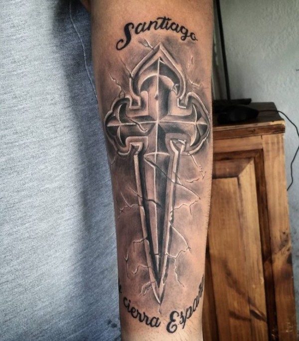 男生手臂上黑灰素描点刺技巧创意十字架精致纹身图片