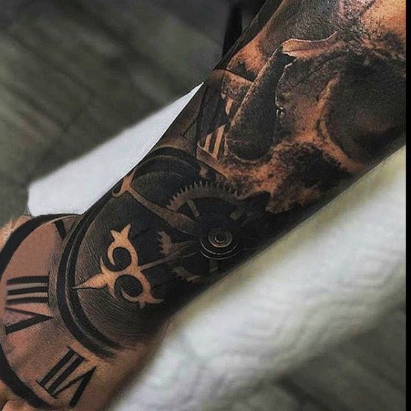 男生手臂上黑灰素描点刺技巧创意骷髅钟表花臂纹身图片