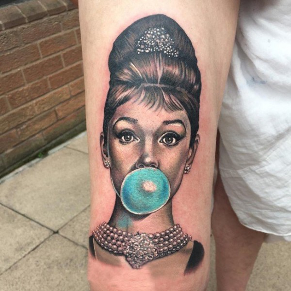 女生手臂上黑灰素描点刺技巧创意奥黛丽赫本人物纹身图片
