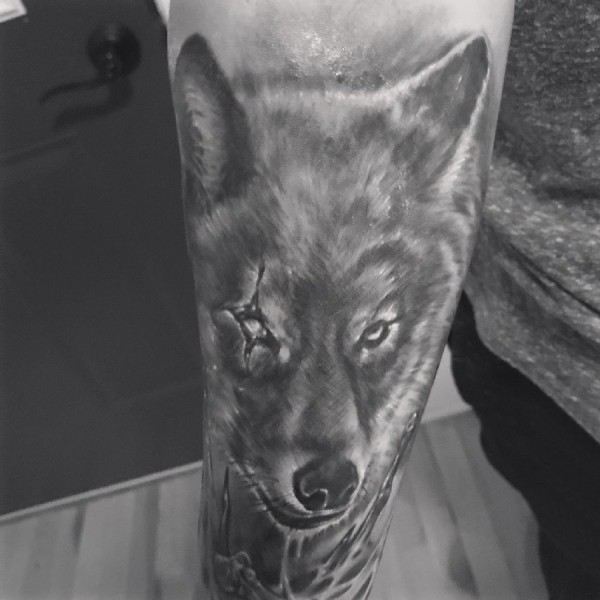 男生手臂上黑灰点刺简单线条小动物狼纹身图片