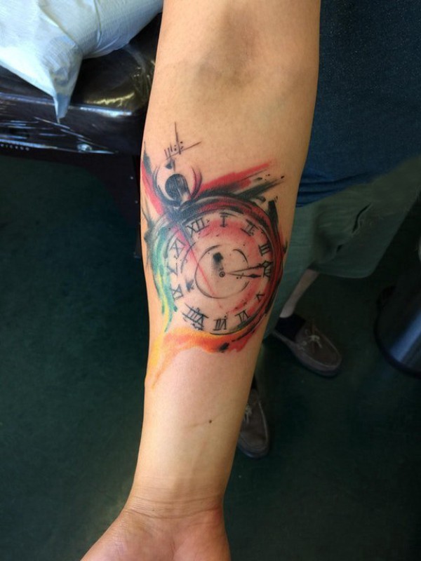 男生手臂上彩绘渐变几何抽象线条时钟纹身图片