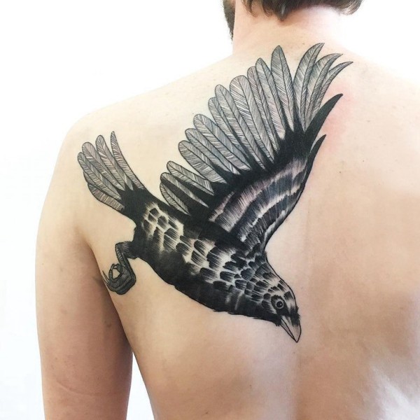 男生后背上黑色点刺简单线条小动物老鹰纹身图片