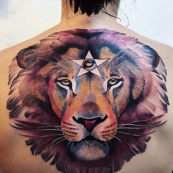 男生背部彩绘水彩素描创意大面积狮子纹身图片