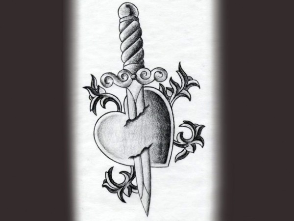 黑灰素描点刺技巧创意心形匕首纹身手稿