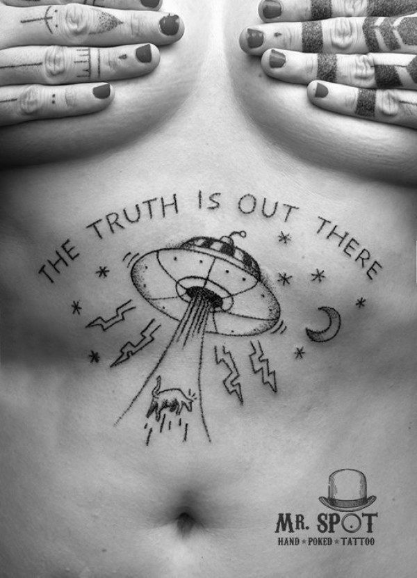 女生胸部黑色简单几何线条英文星球和飞碟纹身图片