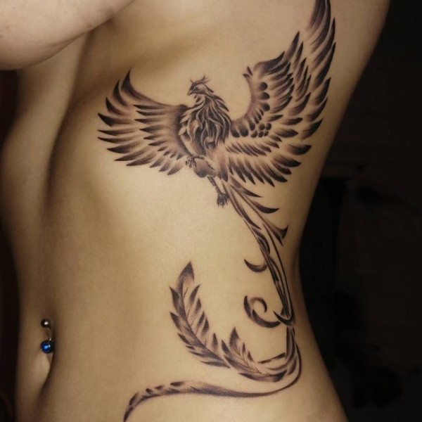 男生侧腰上黑灰素描点刺技巧创意大面积凤凰纹身图案
