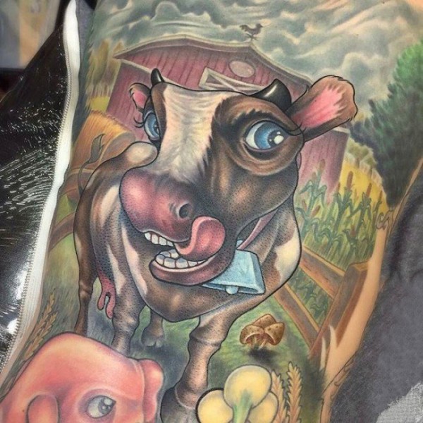 男生背部彩绘水彩素描创意大面积满背牛动物纹身图片