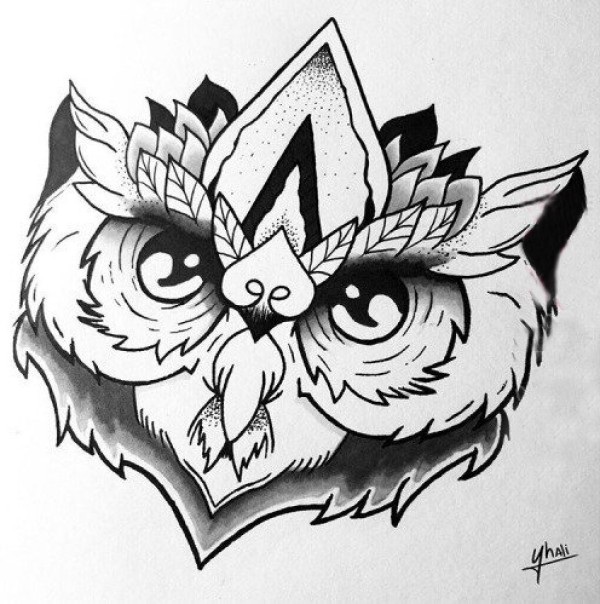 黑灰素描创意精致唯美花纹猫头鹰纹身手稿