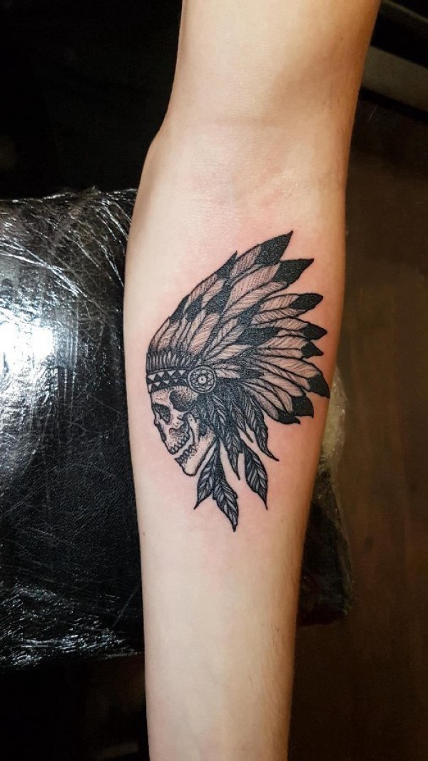 女生手臂上黑色点刺简单线条骷髅印第安人纹身图片