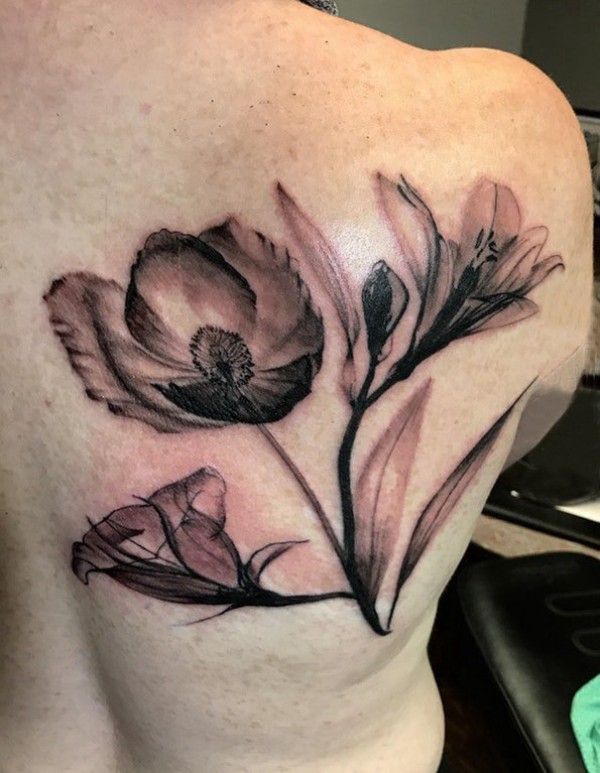 女生后背上黑灰点刺抽象线条文艺植物花朵纹身图片