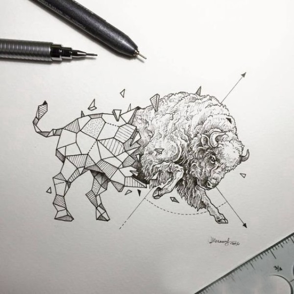 创意十足的黑色点刺几何简单线条小动物牛纹身手稿