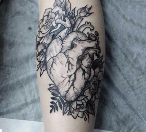 女生小腿上黑色点刺抽象线条植物和心脏纹身图片