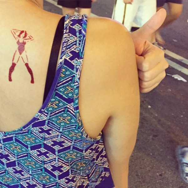 女生后背上黑色点刺简单线条创意卡通人物纹身图片
