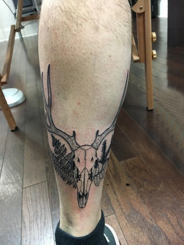男生小腿上黑色点刺几何线条创意骷髅头骨纹身图片