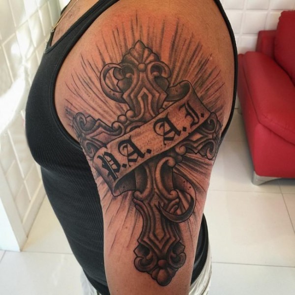 男生手臂上黑灰素描点刺技巧创意十字架有意义纹身图片