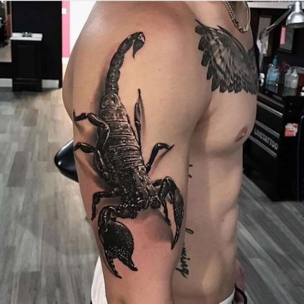 男生手臂上黑灰素描点刺技巧创意蝎子3d纹身图片