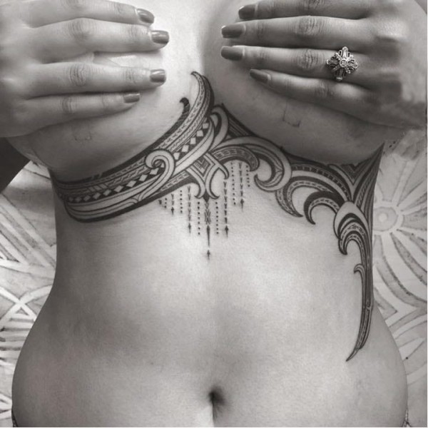 女生后腰纹身黑白灰风格抽象线条纹身图案
