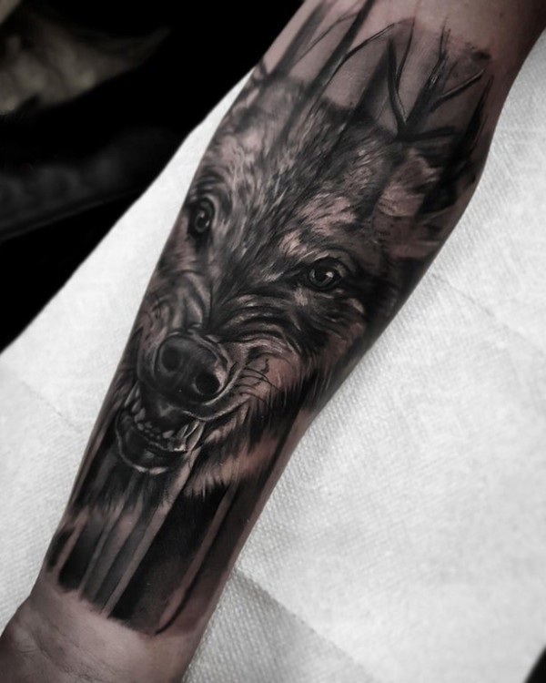 男生手臂上黑色点刺简单线条小动物狼纹身图片