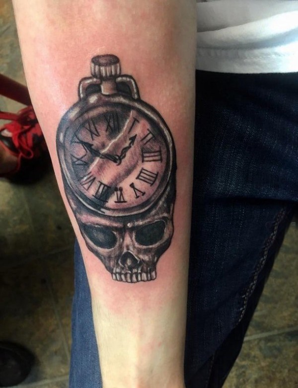 男生手臂上黑灰素描点刺技巧创意钟表骷髅纹身图片