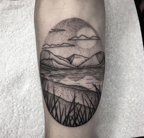 男生手臂上黑灰素描点刺技巧创意文艺风景纹身图片