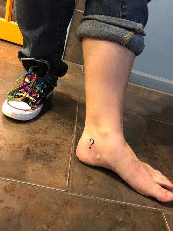 男生脚踝上黑色线条简单有趣的问号纹身图片