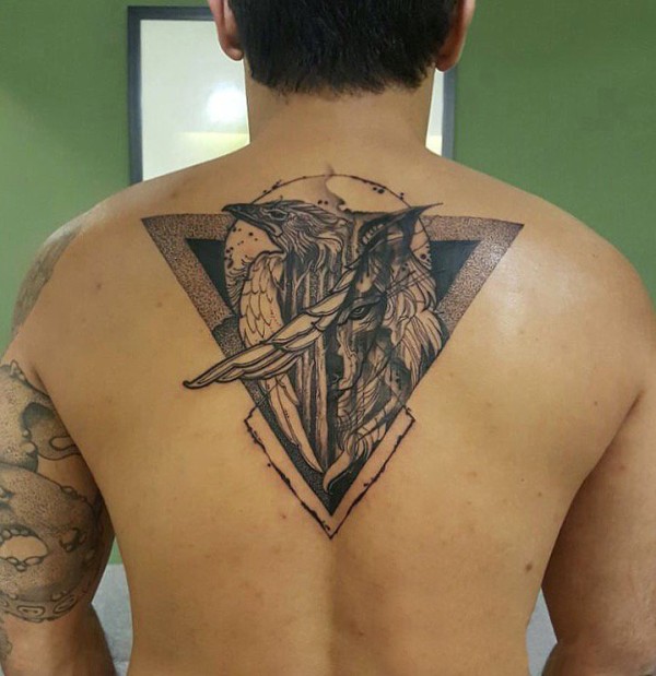 男生后背上黑色点刺几何线条小动物老鹰纹身图片