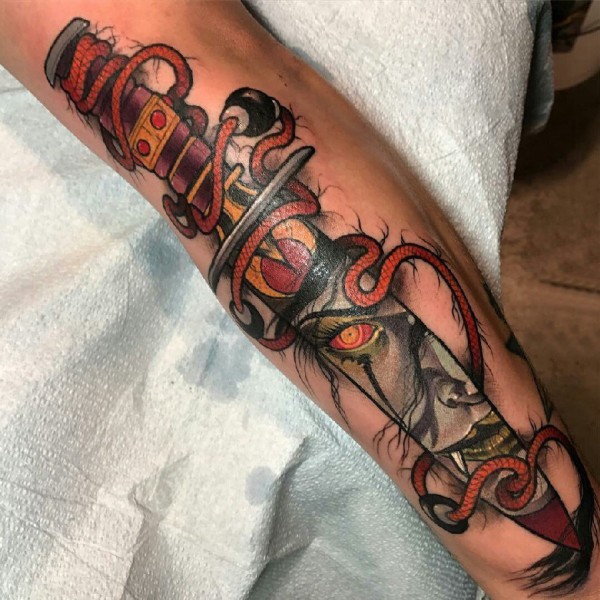 男生手臂上彩绘几何抽象线条人物和匕首纹身图片
