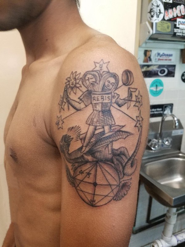 男生手臂上黑色点刺几何线条创意卡通人物纹身图片