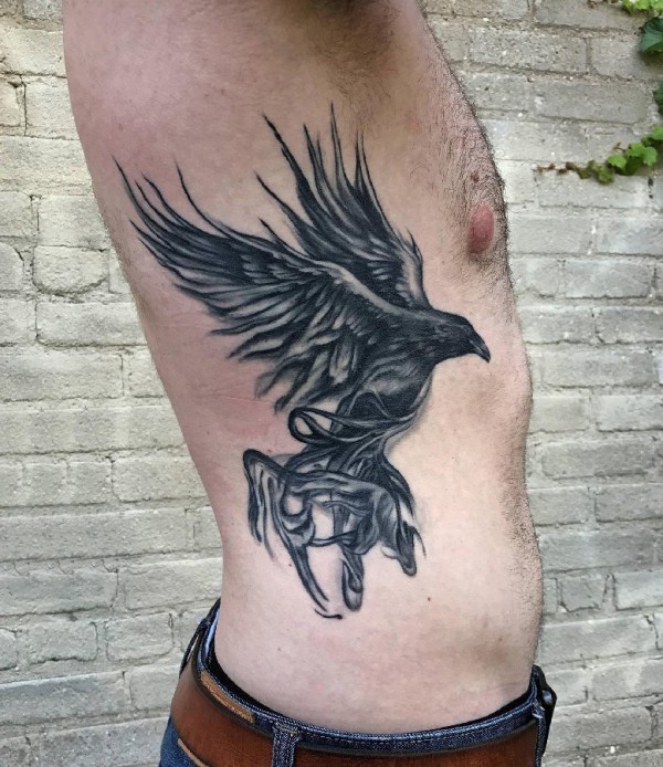 男生侧腰上黑色点刺简单线条创意小动物老鹰纹身图片