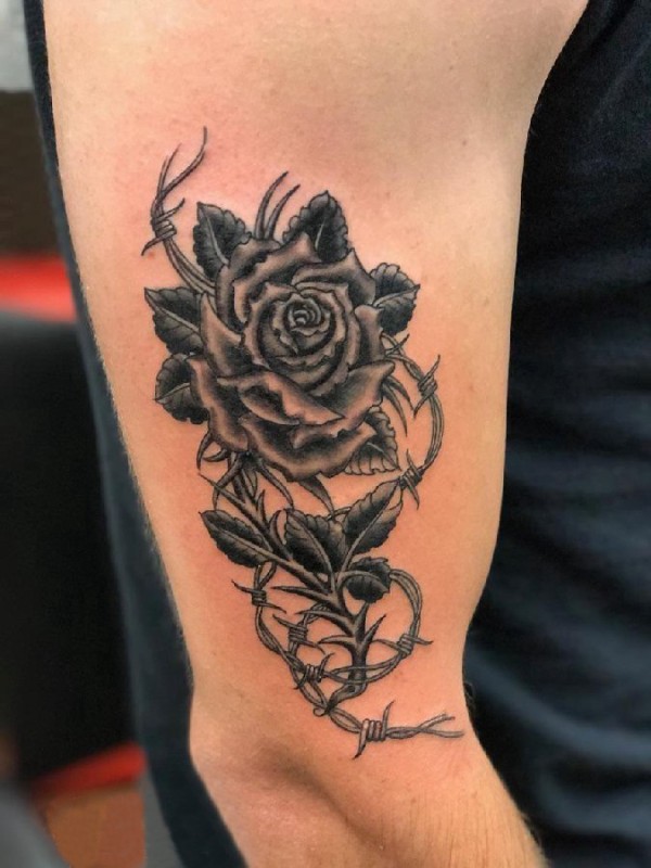 男生手臂上黑色点刺抽象线条创意植物花朵玫瑰纹身图片