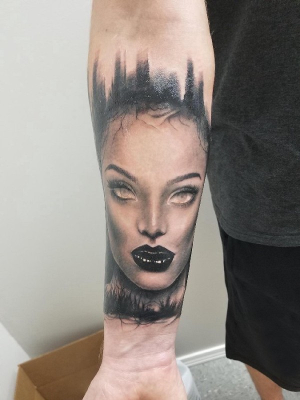 男生手臂上黑灰素描点刺技巧创意女生人物纹身图片