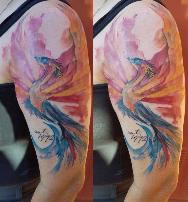 男生手臂上彩绘水彩素描泼墨创意凤凰纹身图片