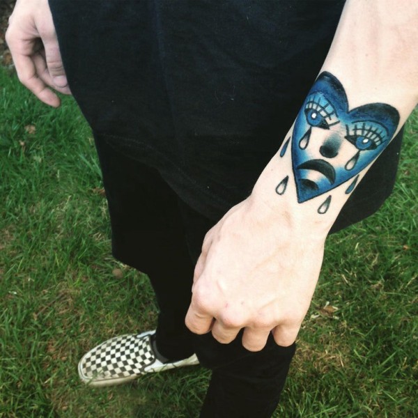 男生手臂上彩绘渐变几何线条眼睛和心形纹身图片