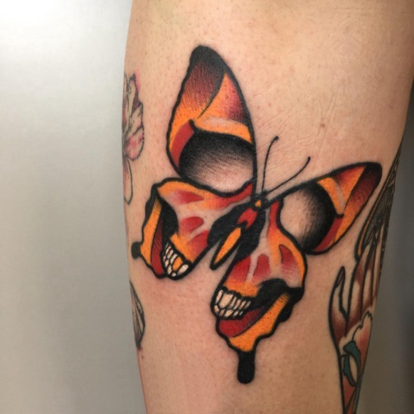 男生手臂上彩绘简单抽象线条骷髅和蝴蝶纹身图片
