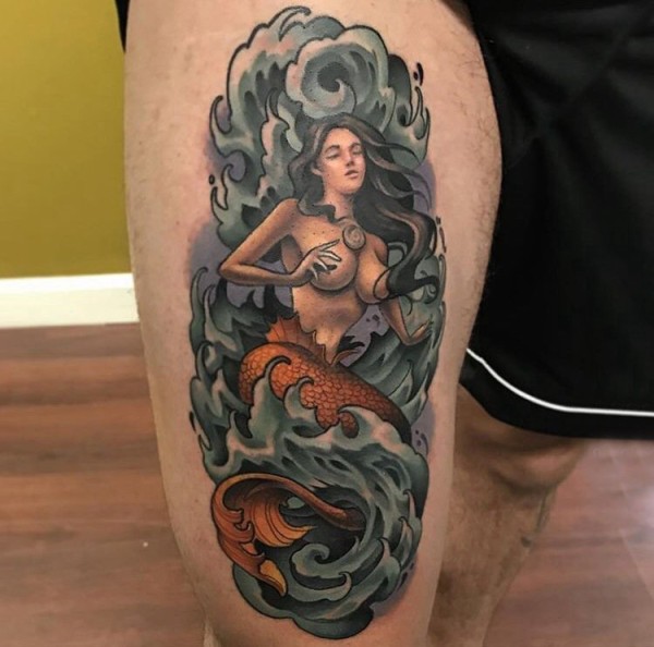 男生大腿上彩绘水彩素描创意文艺美人鱼纹身图片