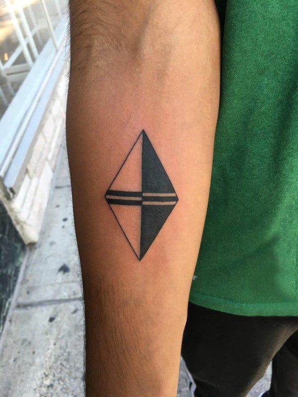男生手臂上黑色几何线条创意菱形纹身图片