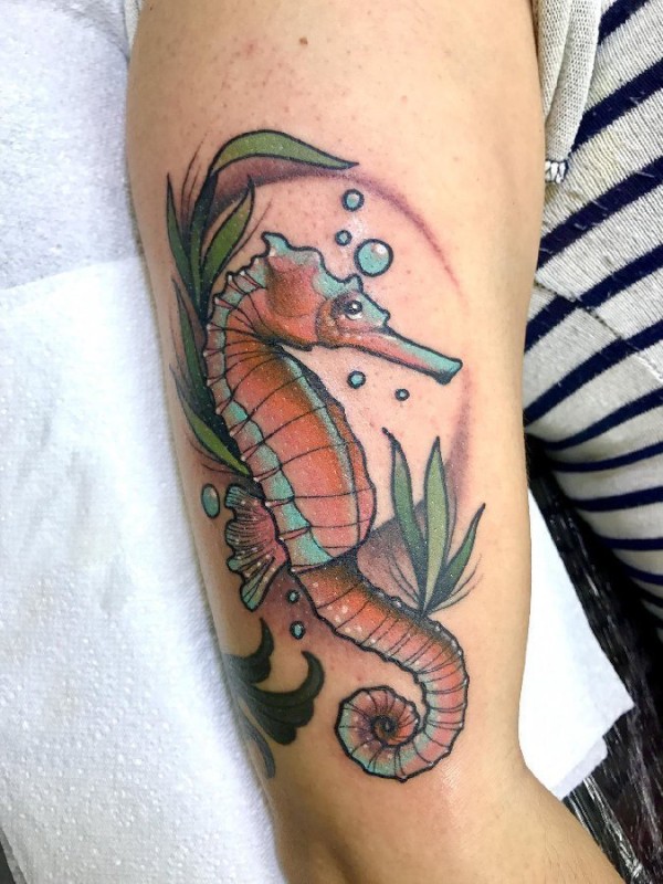 女生手臂上彩绘水彩素描创意文艺海马动物纹身图片