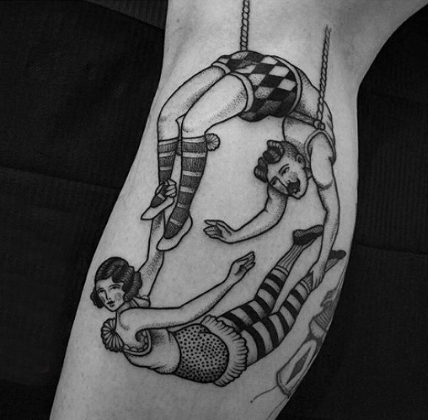 精彩纷呈的黑色点刺简单线条创意马戏团纹身图案