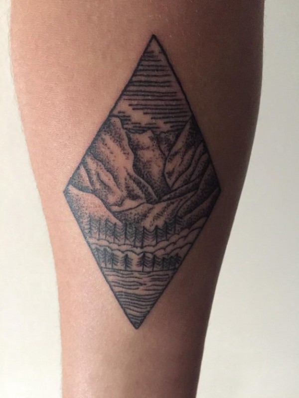 女生小腿上黑色点刺几何菱形抽象线条山水风景纹身图片