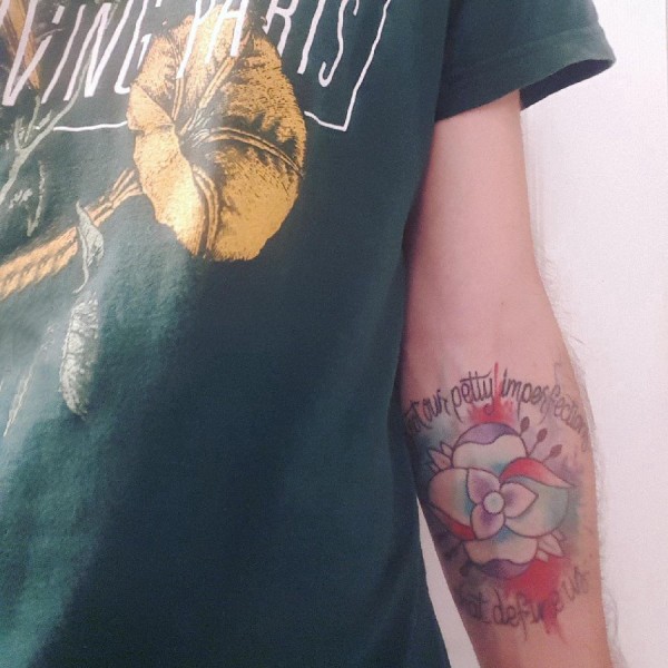 女生手臂上彩绘渐变英文和植物花朵纹身图片