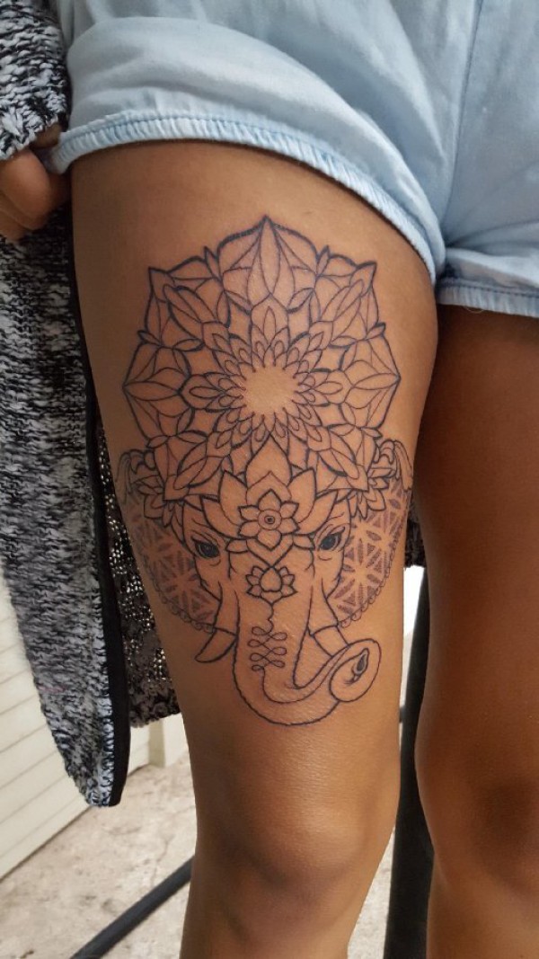 女生大腿上黑色线条创意梵花花纹大象纹身图片